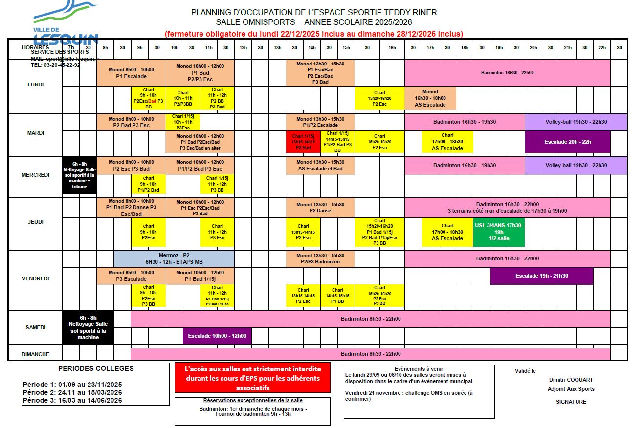 | Vendredi | 16H30-22H00 | Escalade de 19h00 à 21h30. |